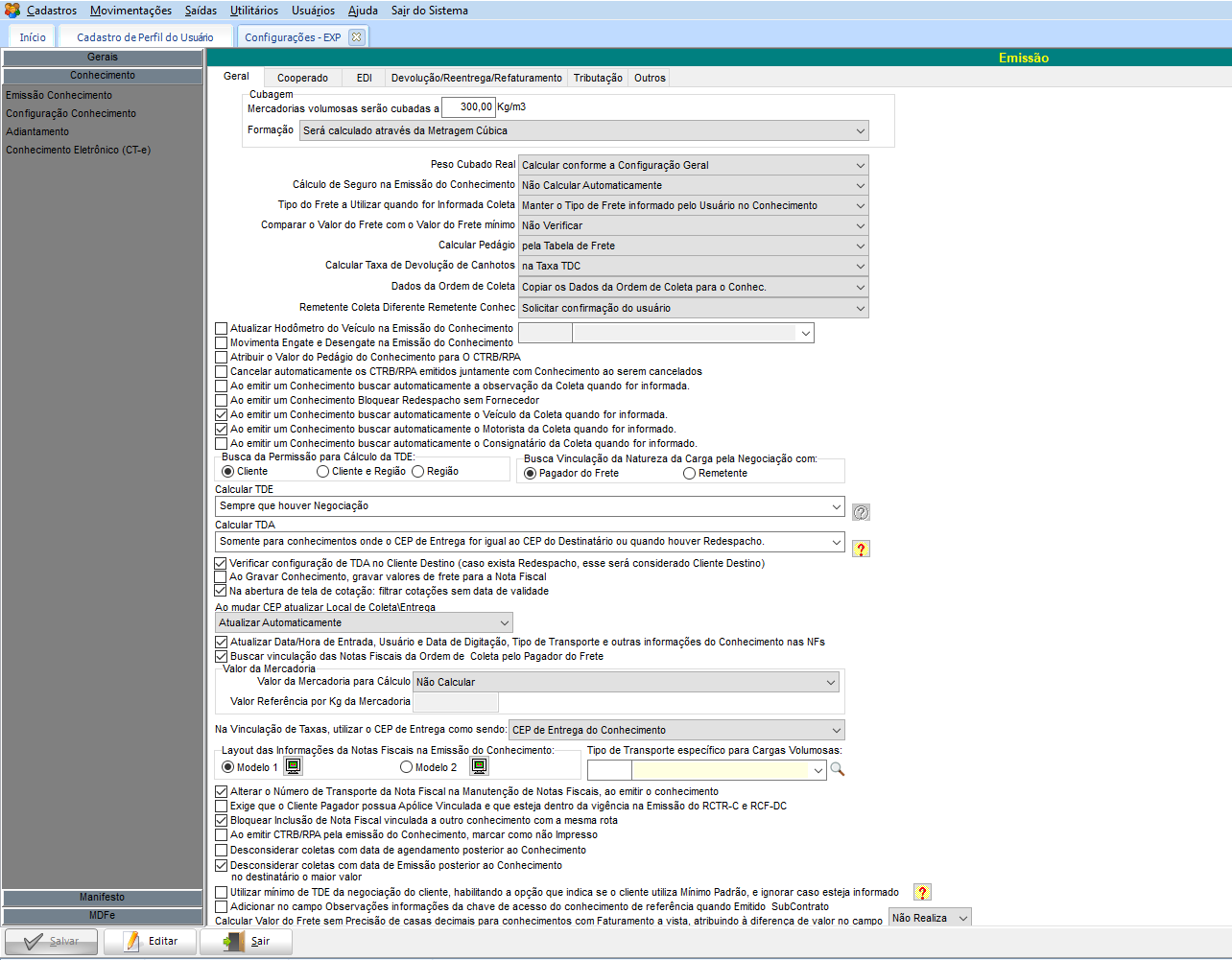 No menu Utilitários > Configurações > TMS > EXP – Expedição, guia Conhecimento > Emissão de Conhecimento, guia Geral, existem algumas configurações que podem influenciar no processo da emissão, considerando primeiro esta tela como uma forma mais genérica, para depois conferir as configurações mais específicas do perfil do usuário.