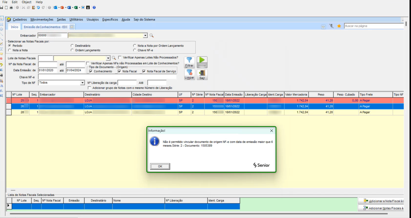 Com a configuração ativa, ao tentar gerar um lote pelo EDI será validada a data de emissão dos documentos vinculados, realizando o bloqueio conforme a imagem abaixo: