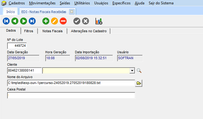 Para consultar as notas importadas, verificar em Movimentações > EDI > Notas Fiscais Recebidas, guia Notas Fiscais.
