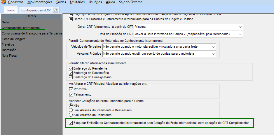 O bloqueio da emissão de Conhecimento Internacional, é realizad quando não informado em tela uma cotação de frete internacional. Por meio de configuração é possível verificar que se tenha controle de quem tem permissão ou não de executar o processo.