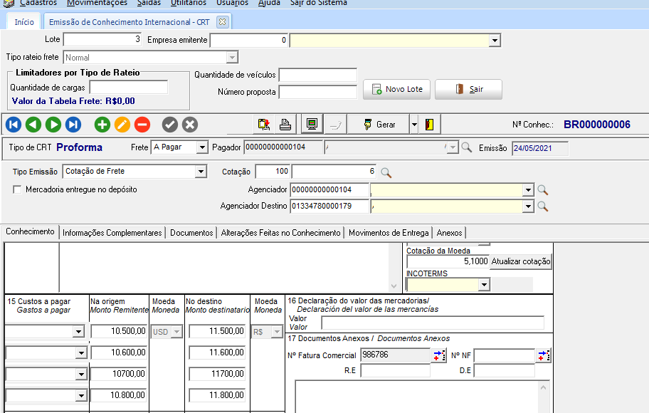 Deste CRT Principal, foi gerado o Proforma. Onde, este terá as mesmas informações do CRT Principal.