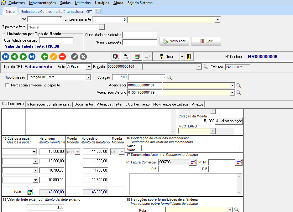 - A moeda e cotação dos valores na Cotação de Frete, deve ser igual a Cotação da moeda e valores no CRT (guia conhecimento, campos Cotação de Moeda, Moeda (tipo, ex: RS, USD) .
