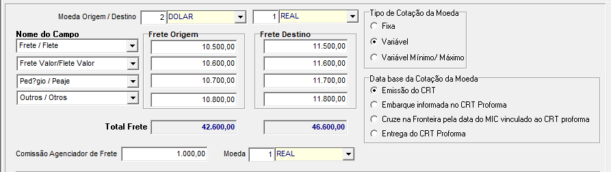 - Moeda: qual a moeda utilizada na comissão do agenciador de frete (campo ao lado)