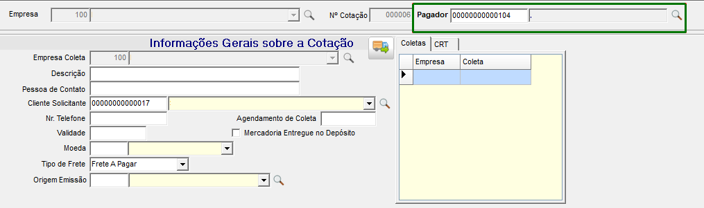 Na geração de CRT do tipo Cotação, o sistema busca os dados da Cotação com os campos relacionados ao tipo de moeda, cotação e pagador do frete.