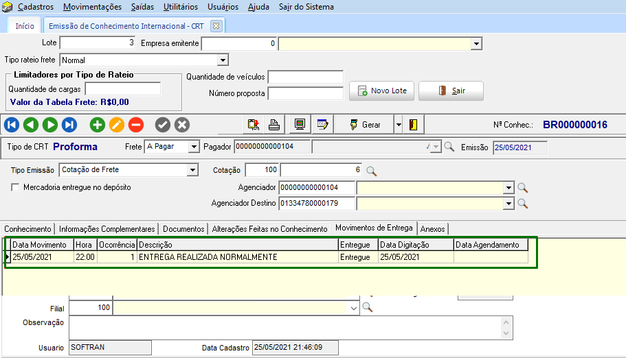 Quando o CRT tiver uma movimentação de entrega e a data registrada, o sistema permite gerar o CRT de Faturamento.