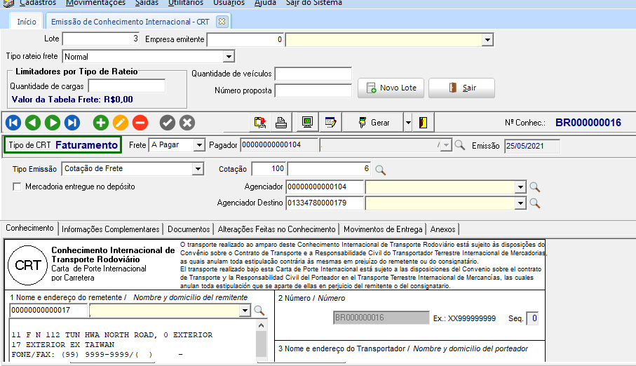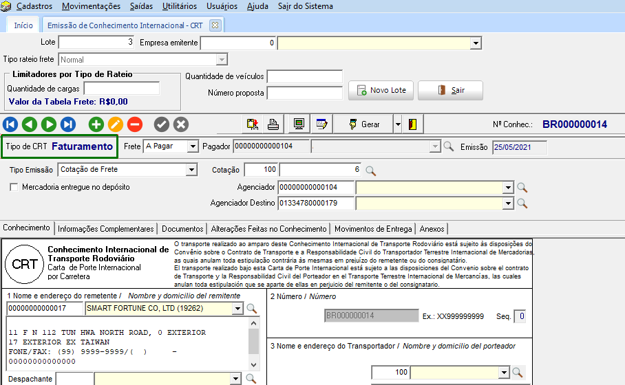 Quando estiver informada, o sistema permite gerar o CRT Faturamento.