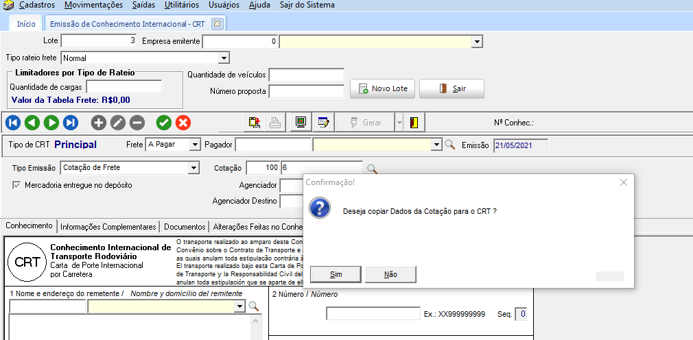 No módulo EXP em Movimentações > Transporte Internacional > Conhecimento Internacional de Transporte Rodoviário – CRT, adicionado um novo e incluído uma cotação. A rotina exibe automaticamente a mensagem se deseja copiar todos os dados da cotação para o CRT, clique em sim.