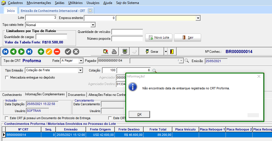 - Data de Embarque informada no CRT Proforma (quando tiver mais de um CRT Proforma, tomar do primeiro que tiver data ou do que tiver data mais antiga)