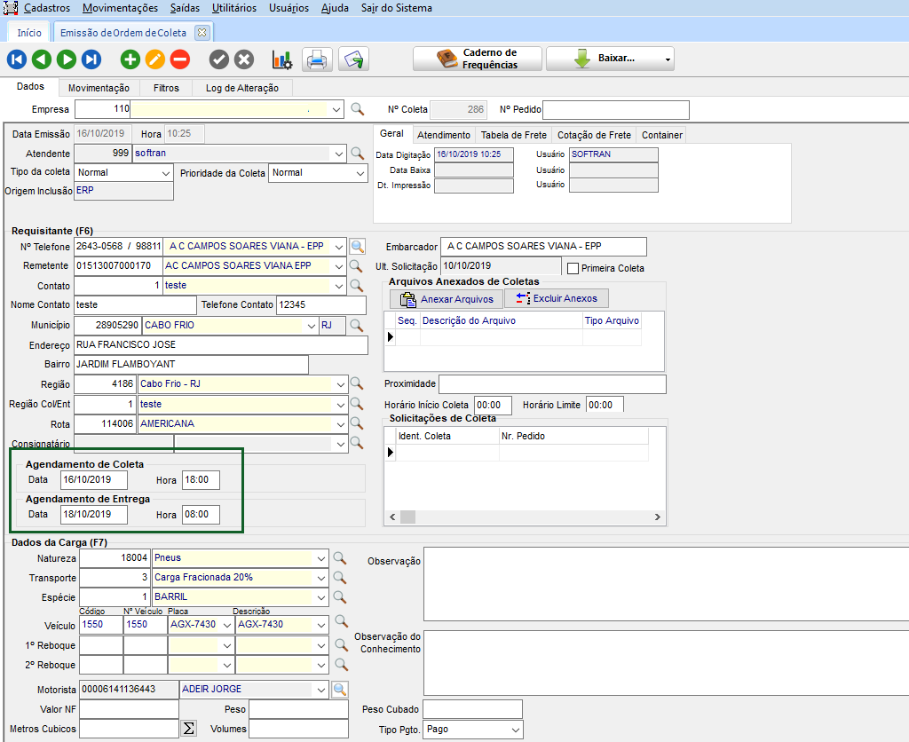 Após realizar as configurações, acesse o módulo CCE, em Movimentações > Controle de Coletas > Ordem de Coleta, cadastrar e/ou consultar uma coleta, onde apresente os dados de Agendamento da Coleta e Agendamento de Entrega.