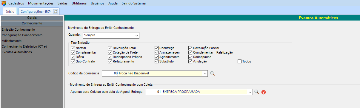 No módulo CFG, em Utilitários > Configurações > TMS > EXP - Expedição, guia Conhecimentos > Eventos Automáticos, adicionado para esta nova guia a configuração já existente no sistema no grupo Ao Vincular Coleta ao Conhecimento.