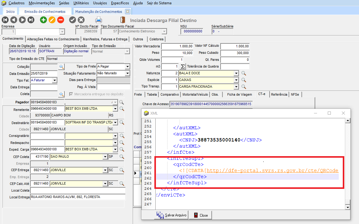Para Exportar QRCode para CT-ena versão 3.00a acesse o módulo EXP, em Movimentações > Conhecimentos > Emissão, cadastre um conhecimento para a mesma empresa que foi configurada no módulo CFG e clique em Imprimir para gerar o XML.