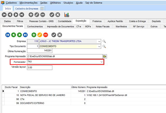 Esta alteração será feita apenas para a van TN3. Na guia Documentos Fiscais, o campo Fornecedor deve ser marcado como TN3.
