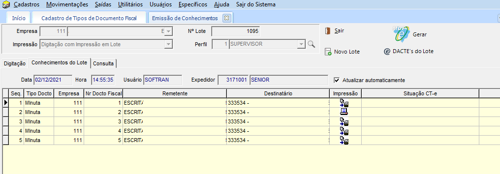 Após configurado na tela de emissão de conhecimentos, quando em um lote tiver vários documentos não fiscais cadastrados, no momento da impressão, destes documentos, o sistema agrupa todos os documentos em apenas uma impressão, ou seja, o usuário verifica por páginas cada documento impressão, fazendo que toda impressão do lote fique agrupada.