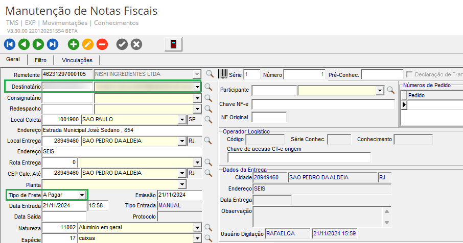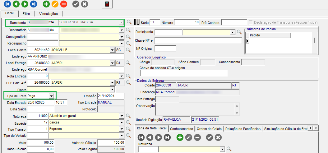 Aqui, é preciso verificar a nota fiscal selecionada para que o tipo de frete esteja de acordo com o pagador do frete. Neste exemplo, o remetente é o pagador, onde foi configurado o conceito de acordo.