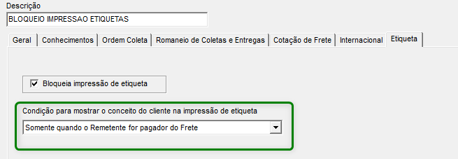 Na tela de Conceitos de Clientes e Fornecedores em Cadastros > Clientes e Fornecedores > Conceito de Clientes e Fornecedores, na guia Etiqueta, existe a opção Bloqueia impressão de etiqueta. Quando esta opção estiver marcada, as condições definidas no campo Condição para mostrar o conceito do cliente na impressão de etiqueta serão aplicadas na tela de impressão de etiquetas. As opções disponíveis são: