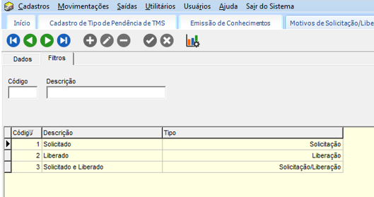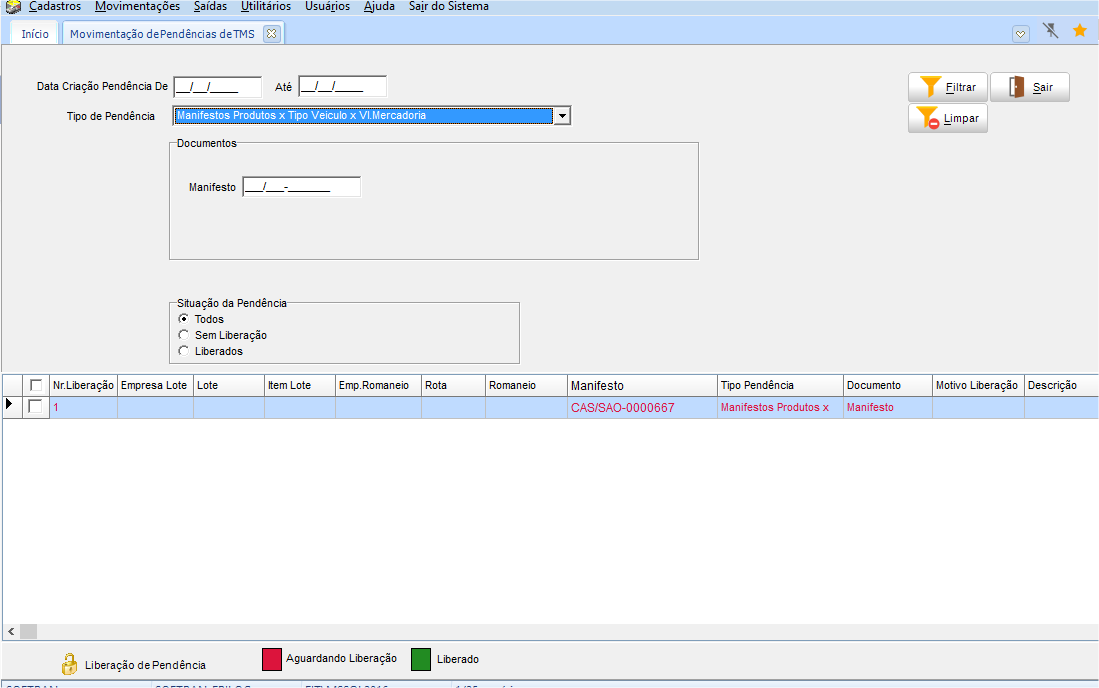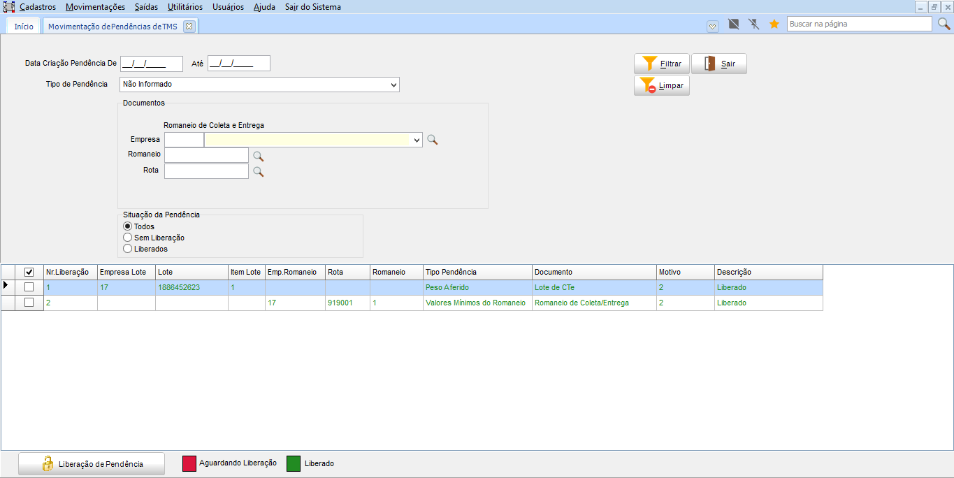 Em Movimentações > Liberação de Pendências TMS, será apresentada as pendências solicitadas, que pode ser filtrada diretamente pelo tipo de pendência.