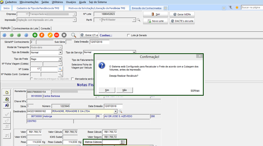 Ainda no EXP m Movimentações > Conhecimentos > Emissão , no cadastrado de um conhecimento, o remetente da nota está vinculado na lista de pendências. O campo Metros Cúbicos ficará em branco. Ao clicar no botão para impressão do conhecimento, o sistema emite a mensagem referente a configuração geral sobre a cubagem, onde o processo deverá ser confirmado.