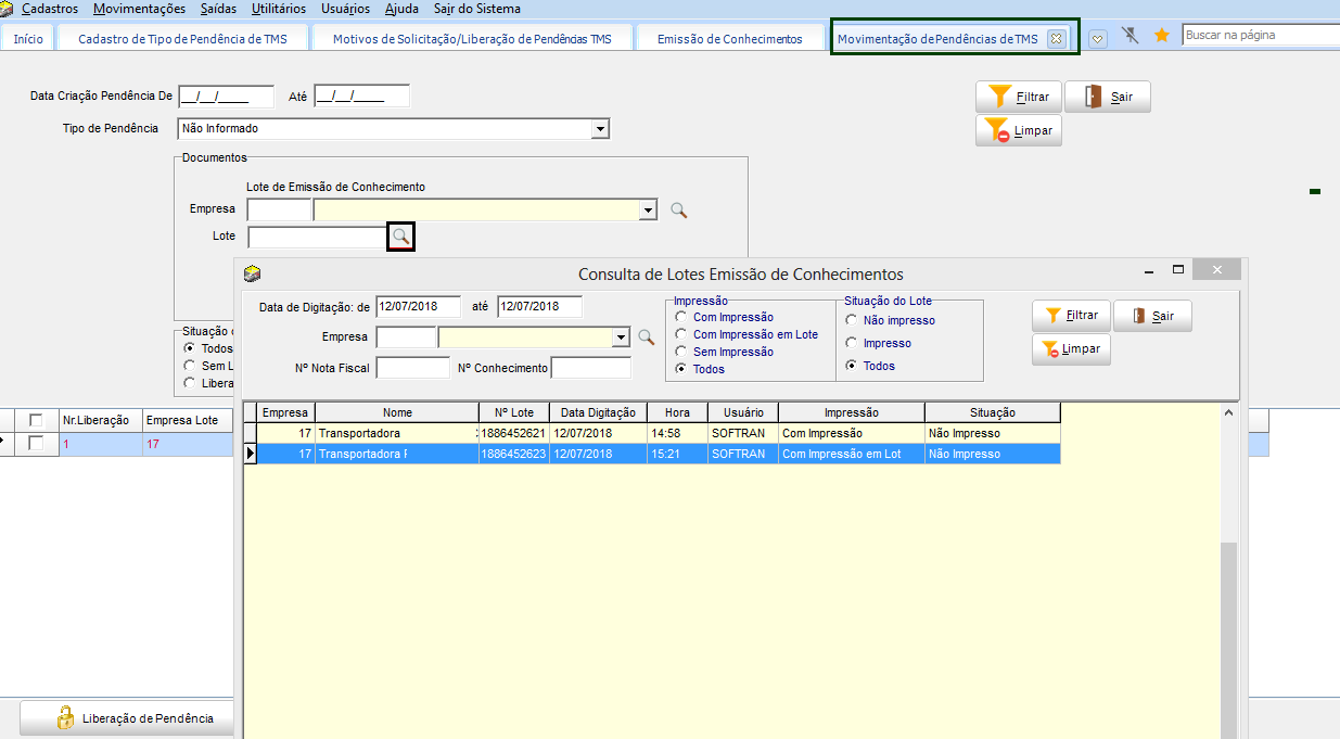 Em Movimentações > Liberação de Pendências TMS, será apresentada as pendências solicitadas, que pode ser filtrada diretamente pelo lote do conhecimento: