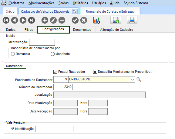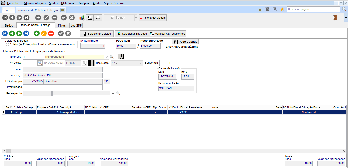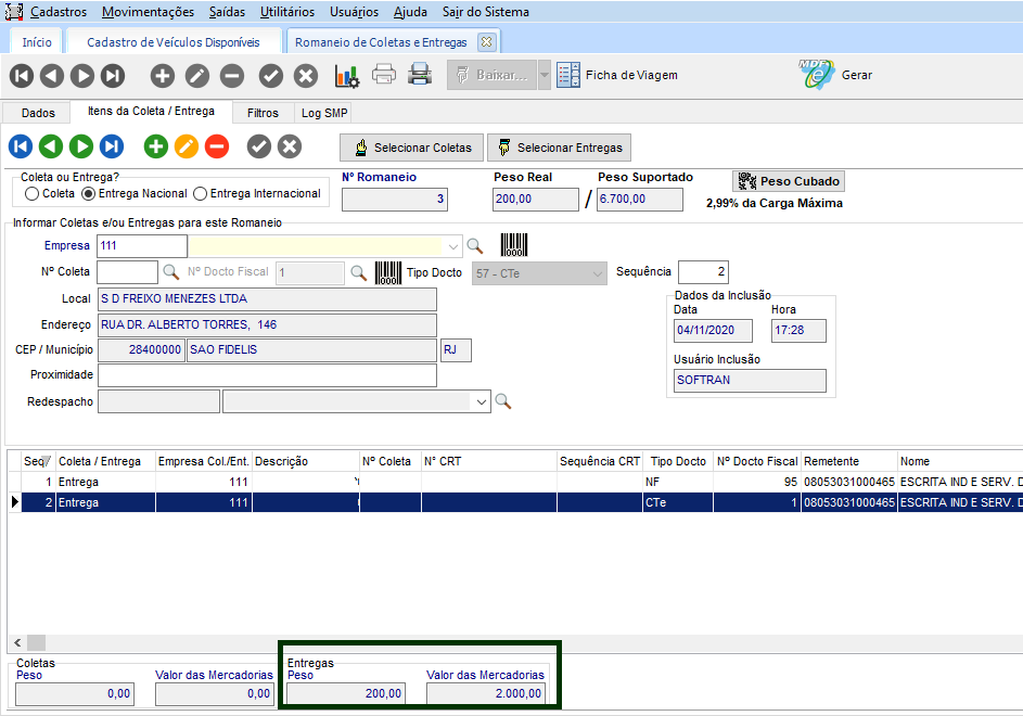 No módulo CCE em Movimentações > Romaneio de Coletas e Entregas, cadastrado um romaneio de entrega, para uma empresa que está na lista de pendências. O peso/valor da mercadoria está abaixo do mínimo.