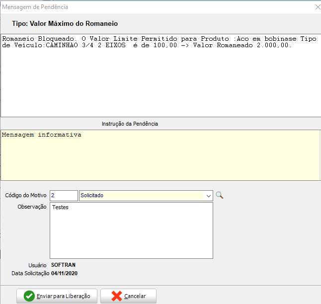 Ao clicar no botão Imprimir, o sistema apresenta a tela de pendências, com os valores máximos cadastrados e o que foi configurado. Desta forma, a rotina pode apresentar mensagem em tela, para que seja preenchido o motivo de acordo com a configuração, pois o romaneio não será impresso enquanto estiver pendente. Clique em Enviar Liberação: