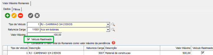 Para gerar pendência de Valores Máximo do Romaneio acesse o módulo EXP em Cadastros > Cadastros Gerais > Tipos de Pendências TMS, com o tipo de pendência Valores Máximo de Romaneio, o sistema permite adicionar o Tipo de Veículo e Natureza de Carga do romaneio, informando o valor máximo que serão validados pelo romaneio de coletas e entregas.