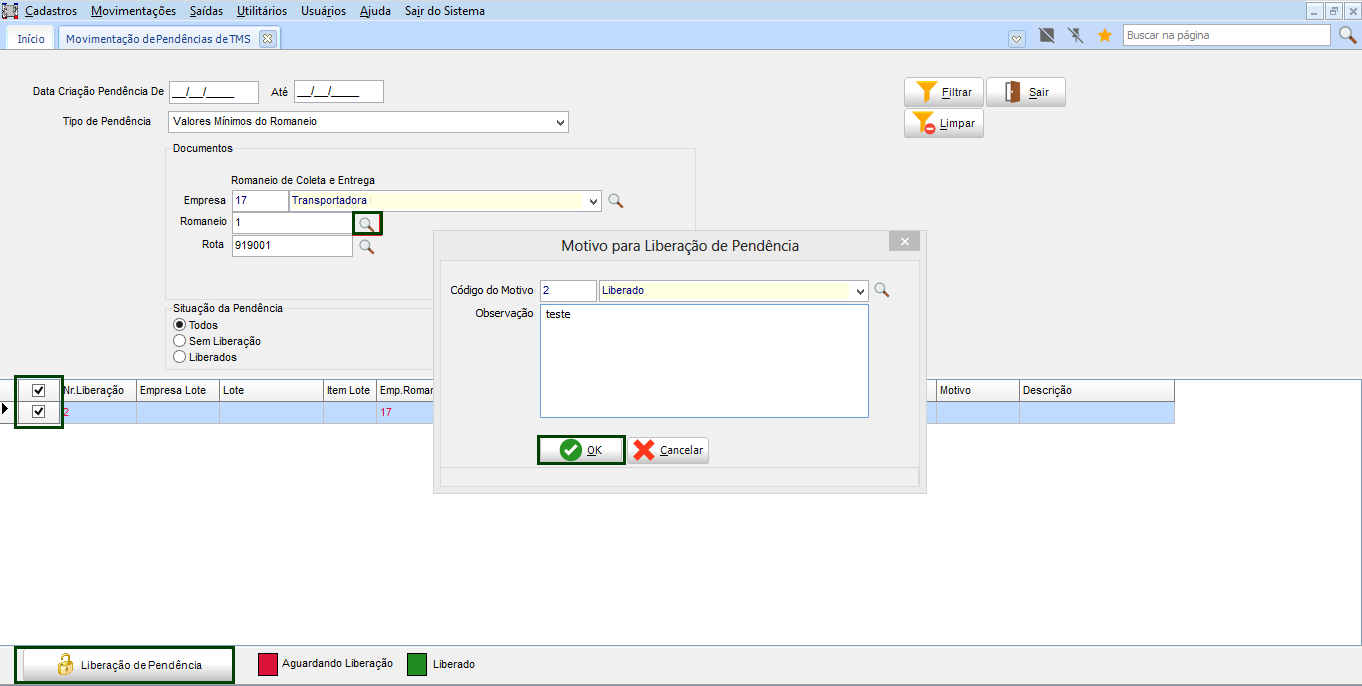 Em seguida é apresentada a tela para informar o motivo da liberação, sendo obrigatório preenchimento de observação de acordo com o que o foi configurado no cadastro. Clique em OK. Assim a pendência é liberada.