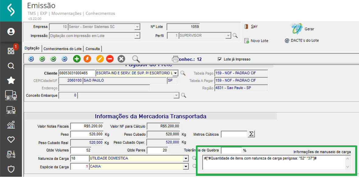 Quando as notas fiscais tiverem itens, aos quais as naturezas de cargas forem do tipo carga perigosa, o sistema verifica as informações de manuseio que estão vinculadas a esta natureza e se existe obrigatoriedade para apresentar no CTe.