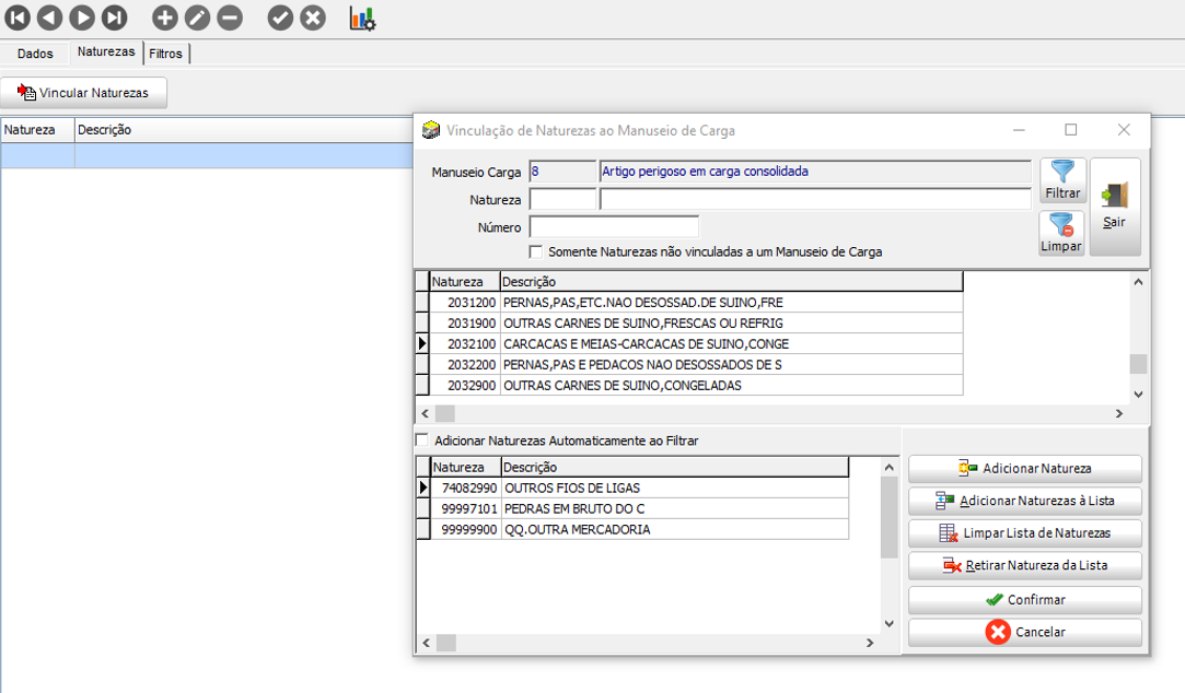 Na tela de Cadastro de Informações de Manuseio da Carga, temos a guia Naturezas, em que no botão Vincular naturezas, é possível adicionar a quantidade de registros necessários em um único manuseio de carga.