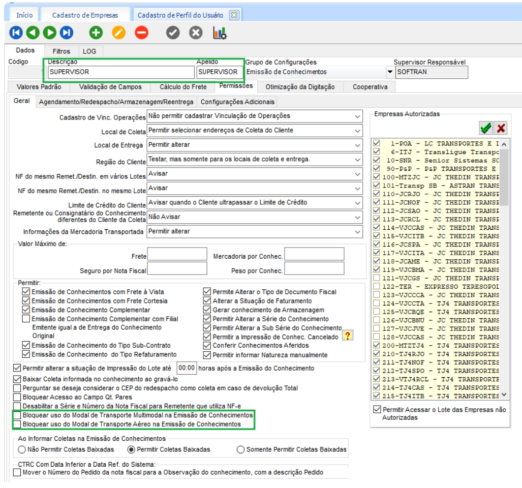 Esses parâmetros, se habilitados apenas aparecerá na tela emissão de conhecimentos o modal rodoviário. Para a emissão de conhecimentos com o modal aéreo ou multimodal, os bloqueios devem estar desabilitados e também é necessário configurar a dll para geração do CT-e.