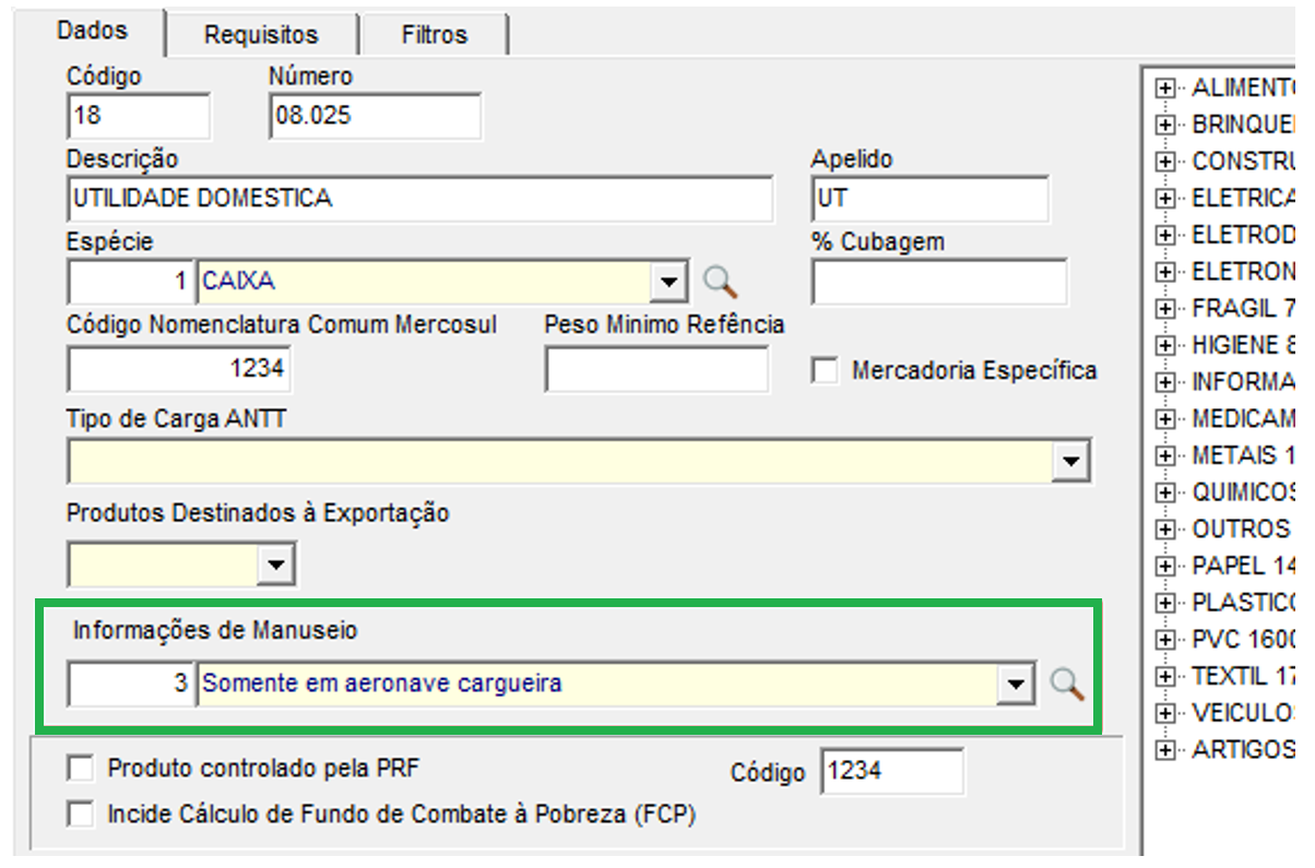 Para Incluir as informações de manuseio no cadastro de natureza de carga acesse Cadastros > Cadastros Gerais > Natureza da Carga, e preencha o campo Informações de Manuseio. Assim no momento da emissão do CT-e Aéreo, o sistema valida a obrigatoriedade desta informação.