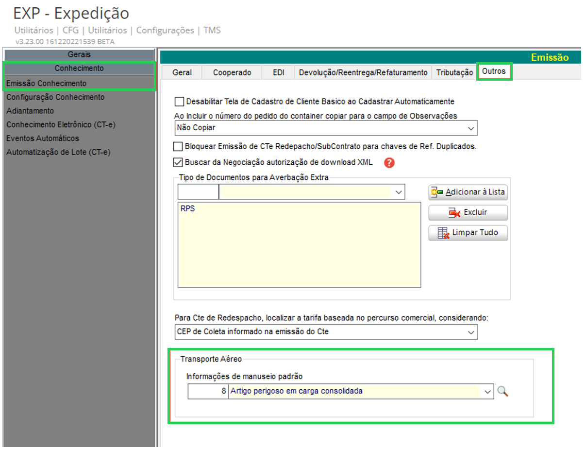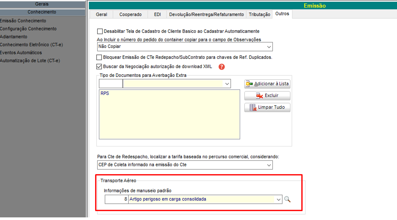 Em Utilitários > Configurações > TMS > EXP – Expedição, na guia Conhecimento > Emissão Conhecimento, sub-guia Outros temos a configuração: Informações de manuseio padrão, referente ao Transporte Aéreo, o sistema busca as informações do Cadastro de Informações de Manuseio da Carga.