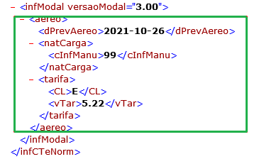 Após realizada a emissão do conhecimento de transporte, o XML irá constar as definições do modal aéreo. Onde: