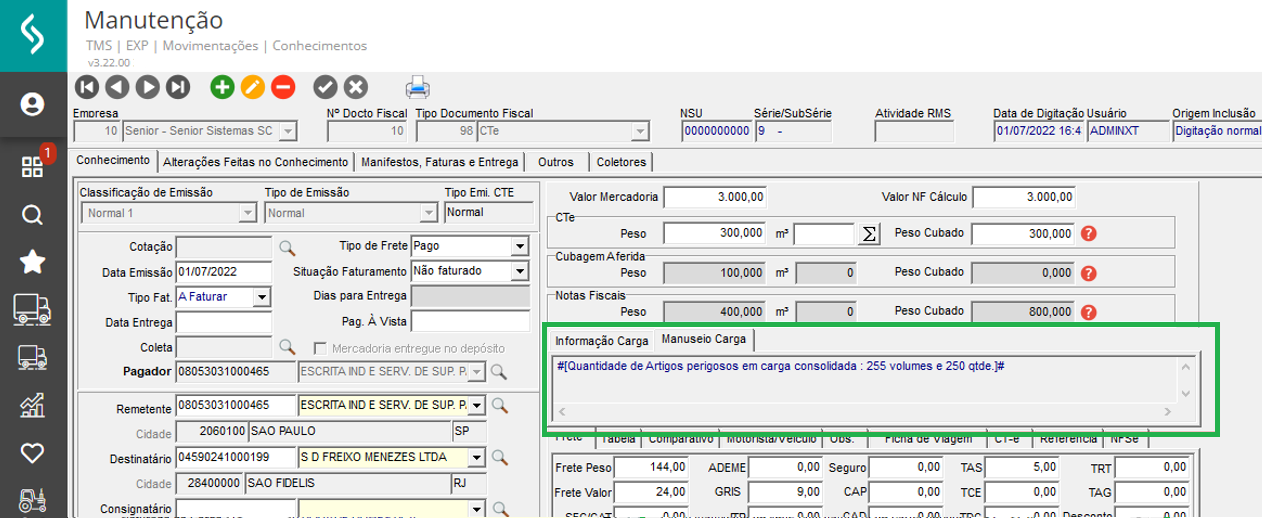 Com a configuração citada acima habilitada, em Movimentações > Conhecimentos > Manutenção, ao lado das informações da carga, adicionado a guia manuseio carga, são apresentados os dados da observação do manuseio da carga que foram adicionados na emissão do conhecimento.