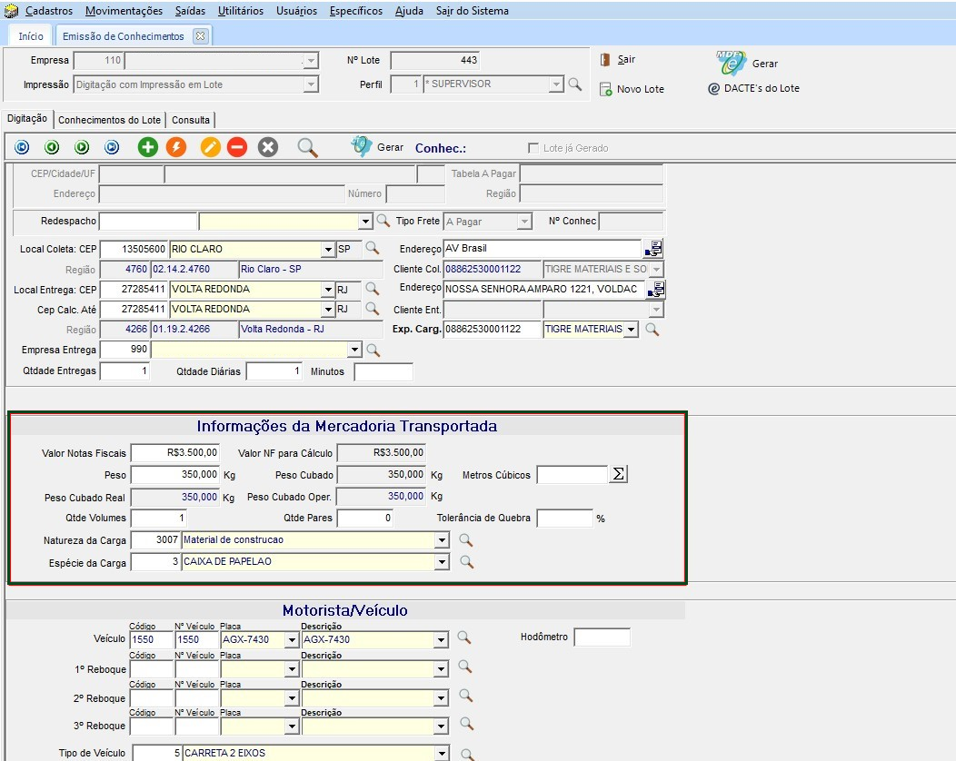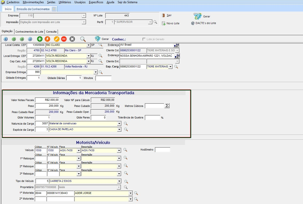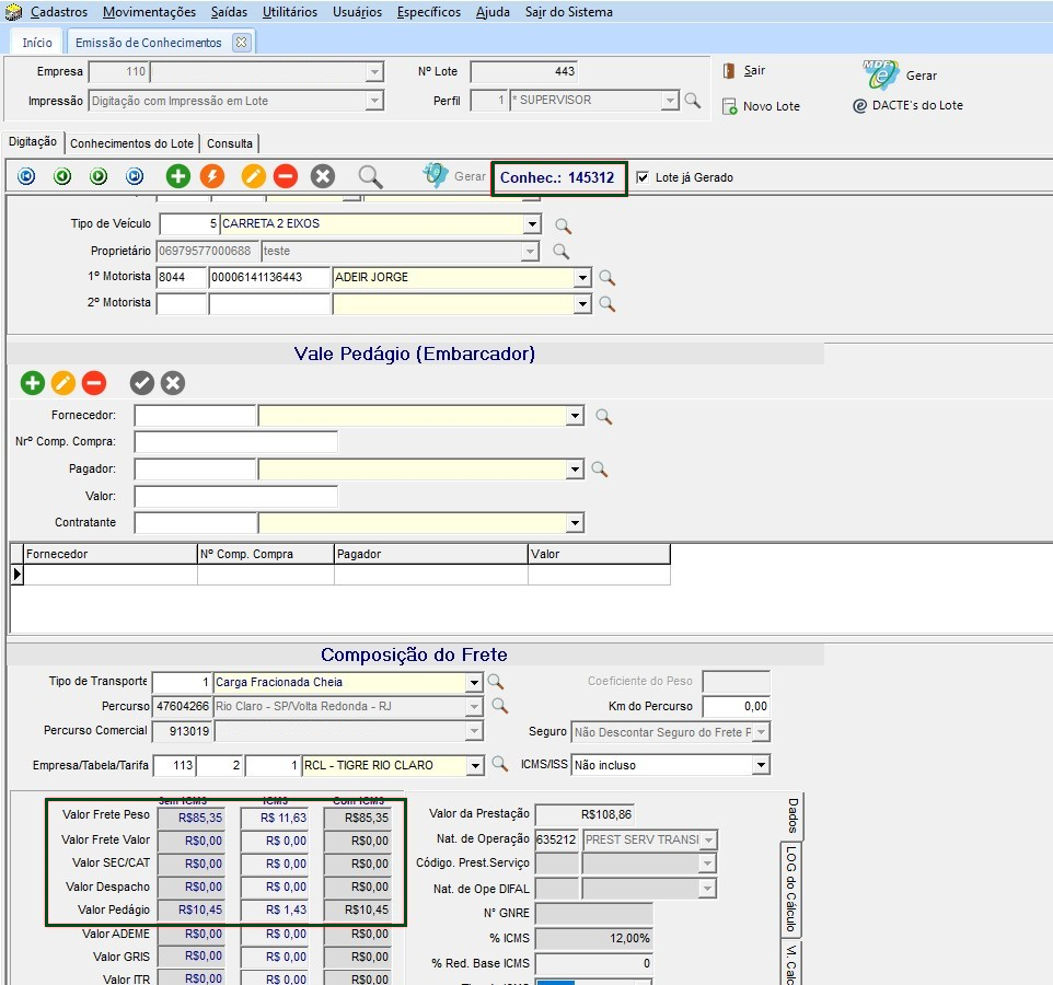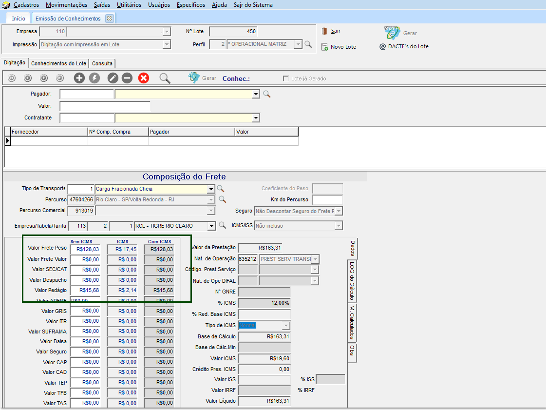 Em Movimentações > Conhecimentos > Emissão, para este exemplo, cadastramos um lote com 3 (três) conhecimentos. Os valores de cada um são: