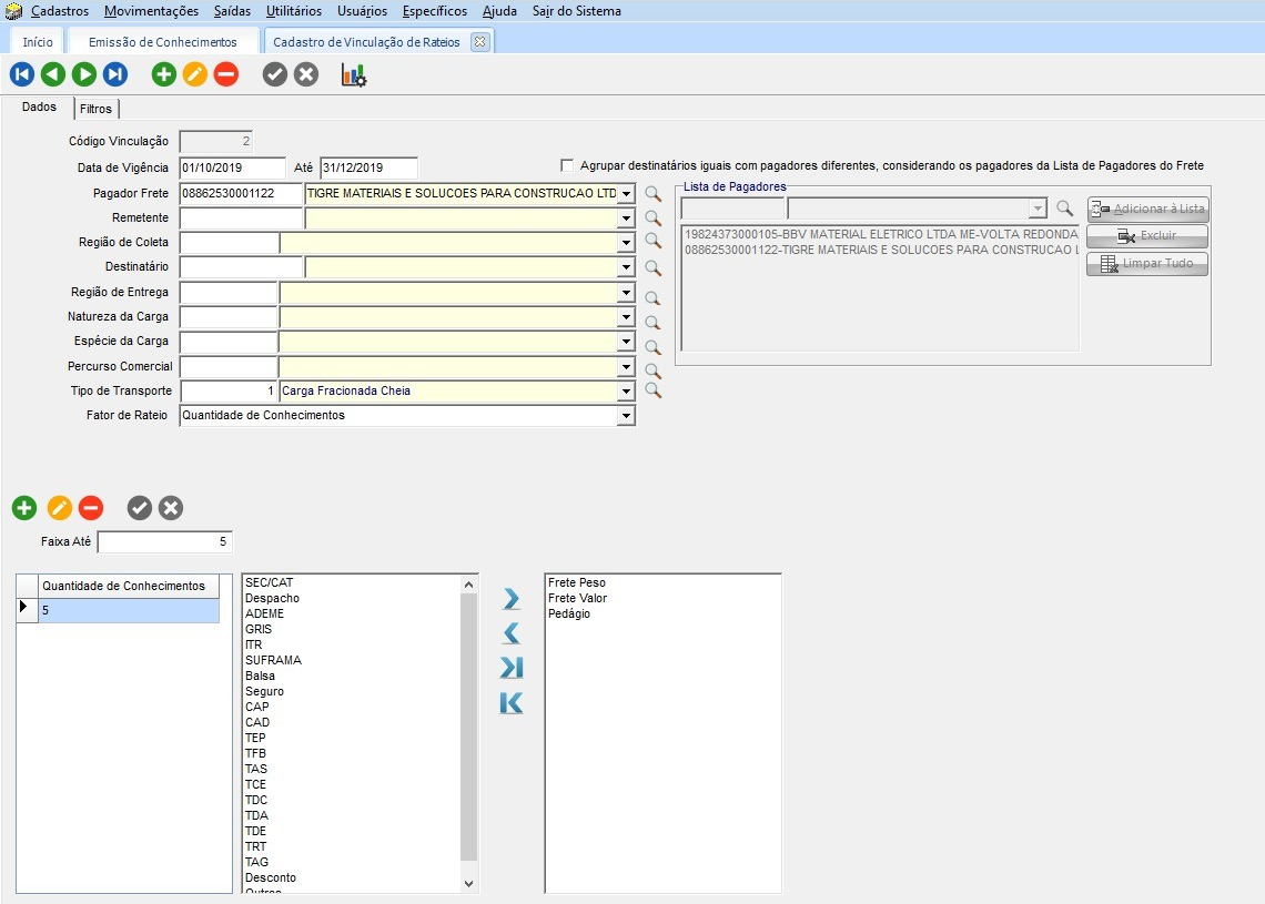 No módulo EXP, em Cadastros > EDI > Vinculação de Rateios, realizado um cadastro que tenha os dados do conhecimento que irá emitir. O campo Pagador deve ser preenchido e o fator de rateio será feito pela quantidade de conhecimentos.