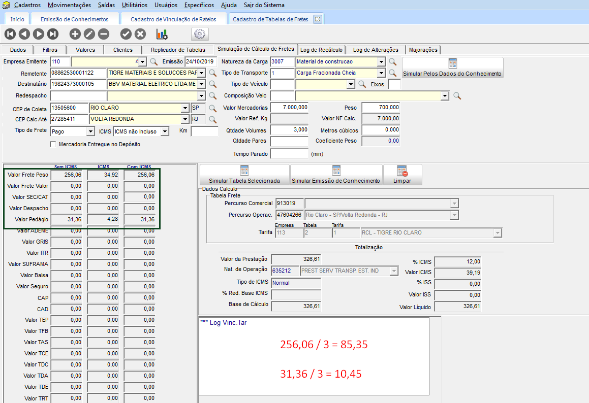Ao clicar em Imprimir, o sistema realiza o rateio dos valores dos conhecimentos, de acordo com os valores abaixo: