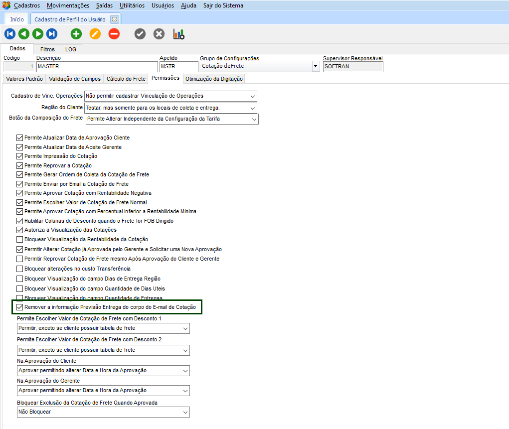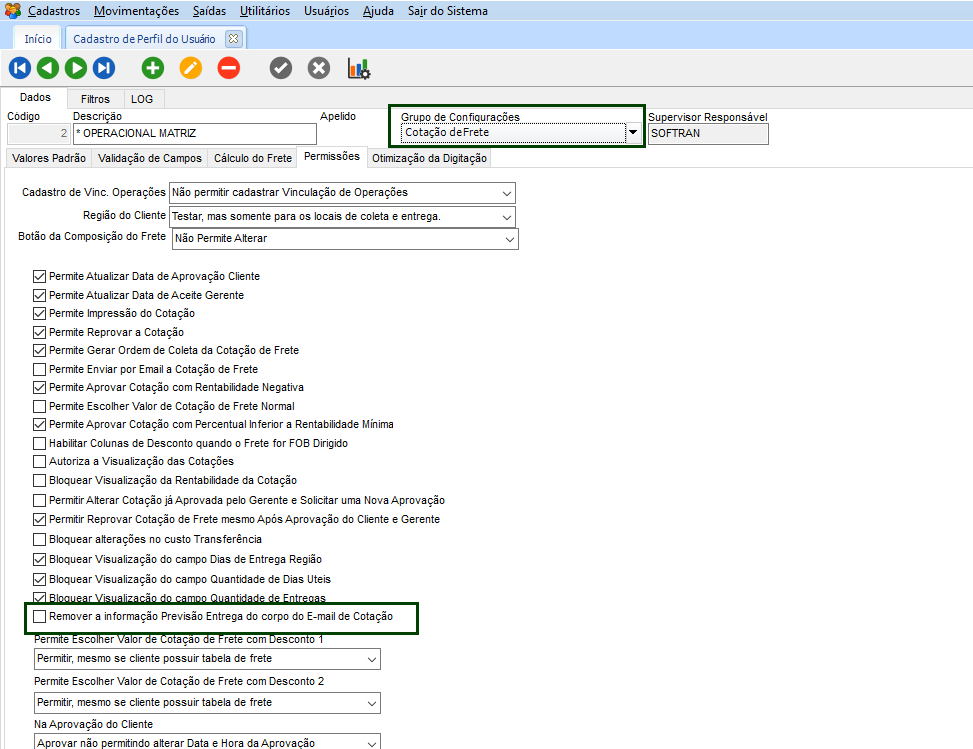 No módulo CFG, em Cadastros > Usuários > Perfil do Usuário, grupo de configurações Cotação de Frete > Permissões, incluímos a configuração: Remover a informação Previsão Entrega do corpo do E-mail de Cotação.