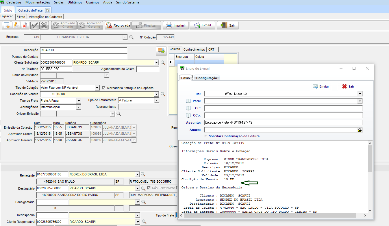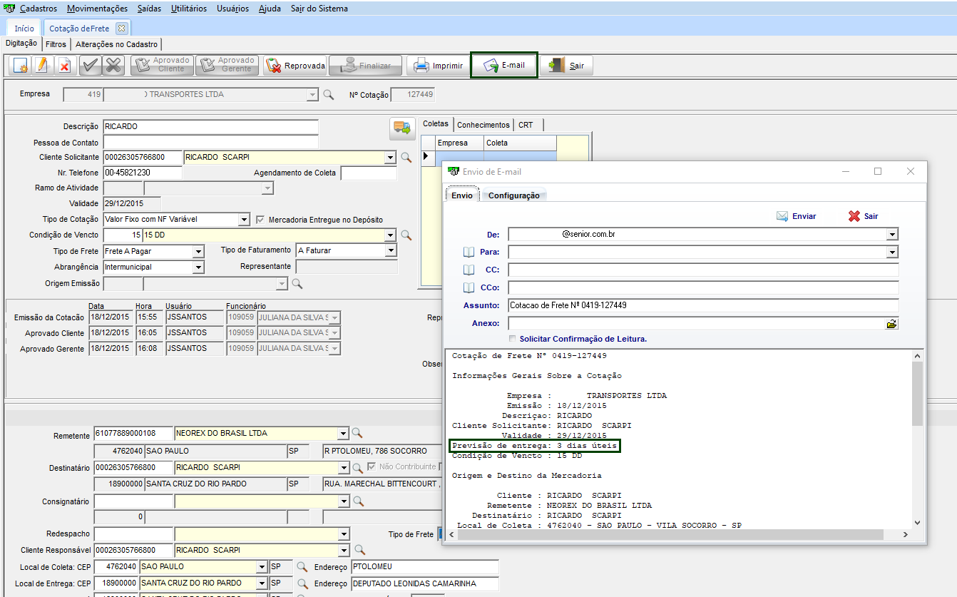 No módulo COM, em Movimentações > Cotação de Frete, cadastrar e/ou selecionar uma cotação e clicar no botão E-mail. O sistema não apresenta mais a informação de previsão de entrega no e-mail.