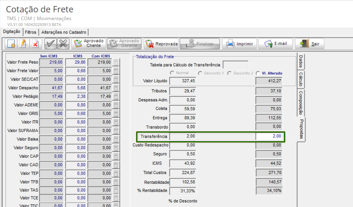 Em Movimentações > Cotação de Frete, na parte de baixo da tela, em Totalização do Frete, guia Propostas são exibidas as informações dos valores, incluindo o valor de Transferência. Se o usuário alterar o valor do campo Transferência para zero (0), o sistema exibe a mensagem de confirmação: