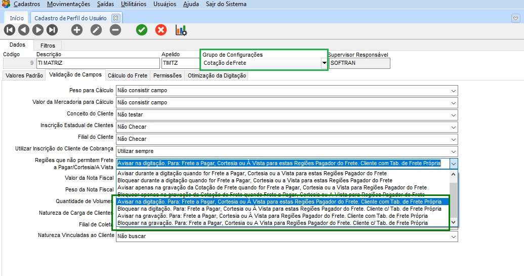 No módulo CFG, em Cadastros > Usuários > Perfil do Usuário, no grupo de configurações: Cotação de Frete > guia Validação de Campos, adicionada novas funcionalidades na configuração já existente: Regiões que não permitem Frete a Pagar/Cortesia/À Vista.