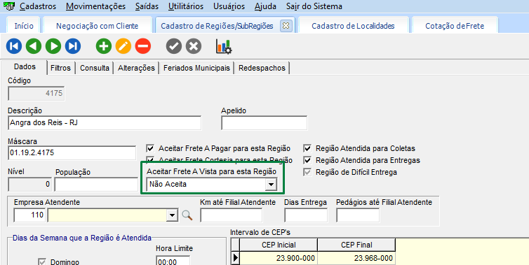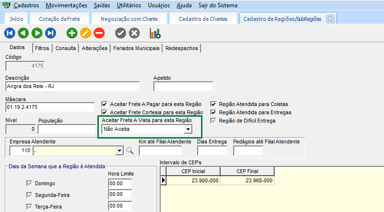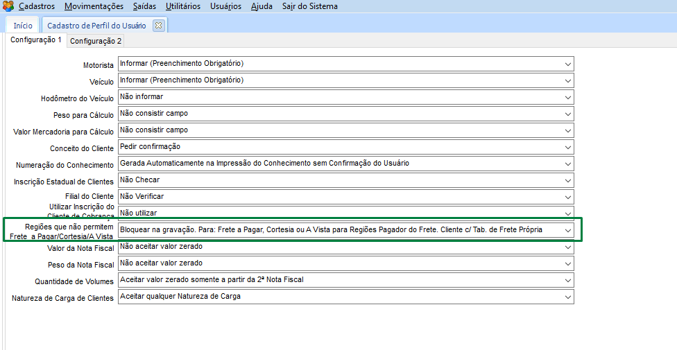 Para esta funcionalidade na configuração do perfil do usuário temos a configuração Regiões que não permitem Frete a Pagar/Cortesia/A Vista, com as opções: