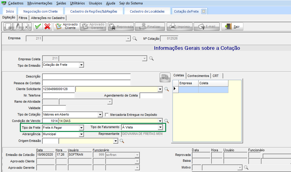 A solução permite bloquear a emissão de cotação, com base na região, conforme regra já existente na emissão do conhecimento. Mantendo as mesmas regras na emissão de conhecimento com a emissão de cotação de frete.