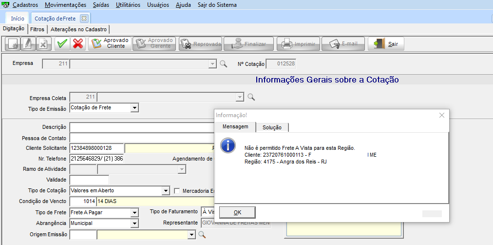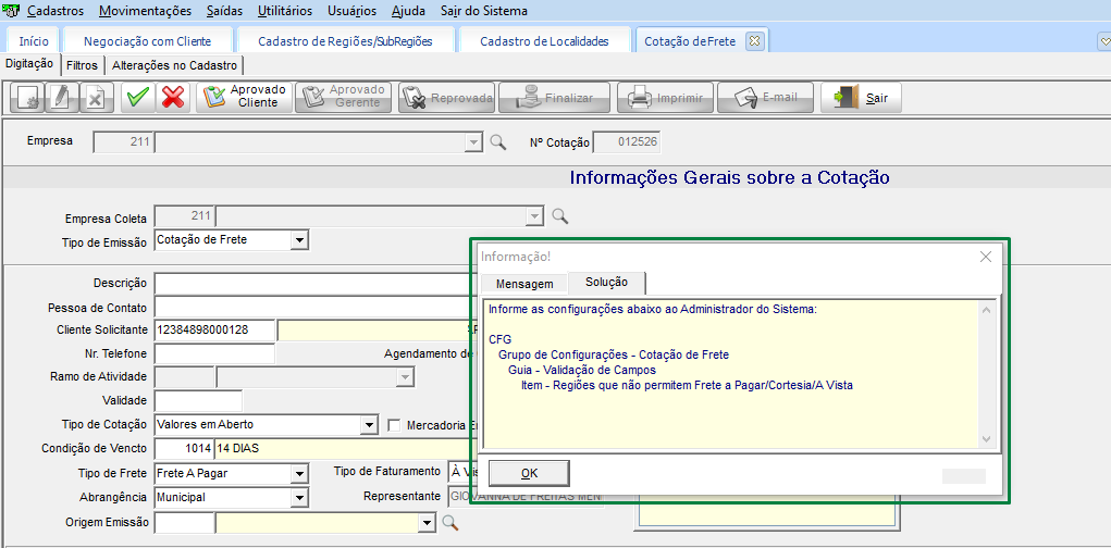 Em Movimentações > Cotação de Frete, cadastrado um novo informando frete a vista e o cliente configurado para o pagador do frete. De acordo com a configuração, ao gravar a tela, o sistema informa a mensagem que não permite de acordo com região informada.