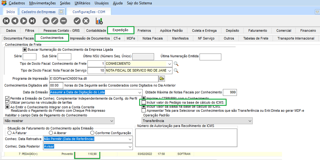 No módulo CFG, em Cadastros > Empresas > guia Expedição > guia Conhecimentos, de acordo com a empresa que deseja incluir ou não o valor do pedágio na base de cálculo do ICMS, deve ser considerada a opção Incluir valor do Pedágio na base de cálculo do ICM