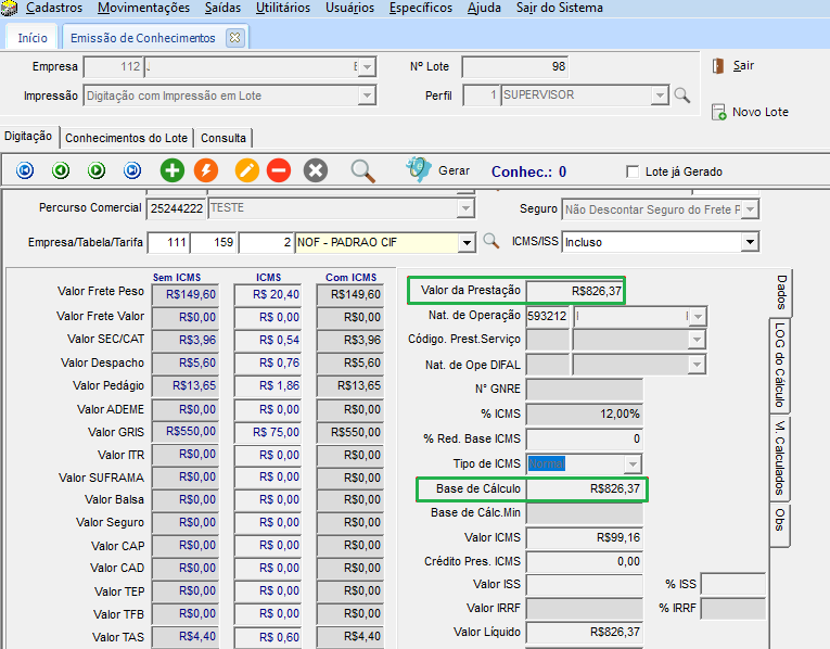 Valor do CTe com pedágio incluso na base, considerando a empresa de coleta: ![]()