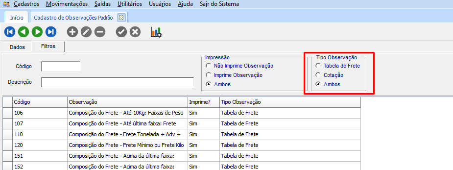 O cadastro de Observações Padrão, possui a configuração por tipo de observação, sendo elas: tabela de frete e cotação. Onde o sistema permite cadastrar novas observações de acordo com o seu tipo.