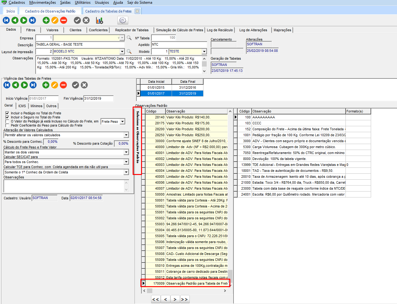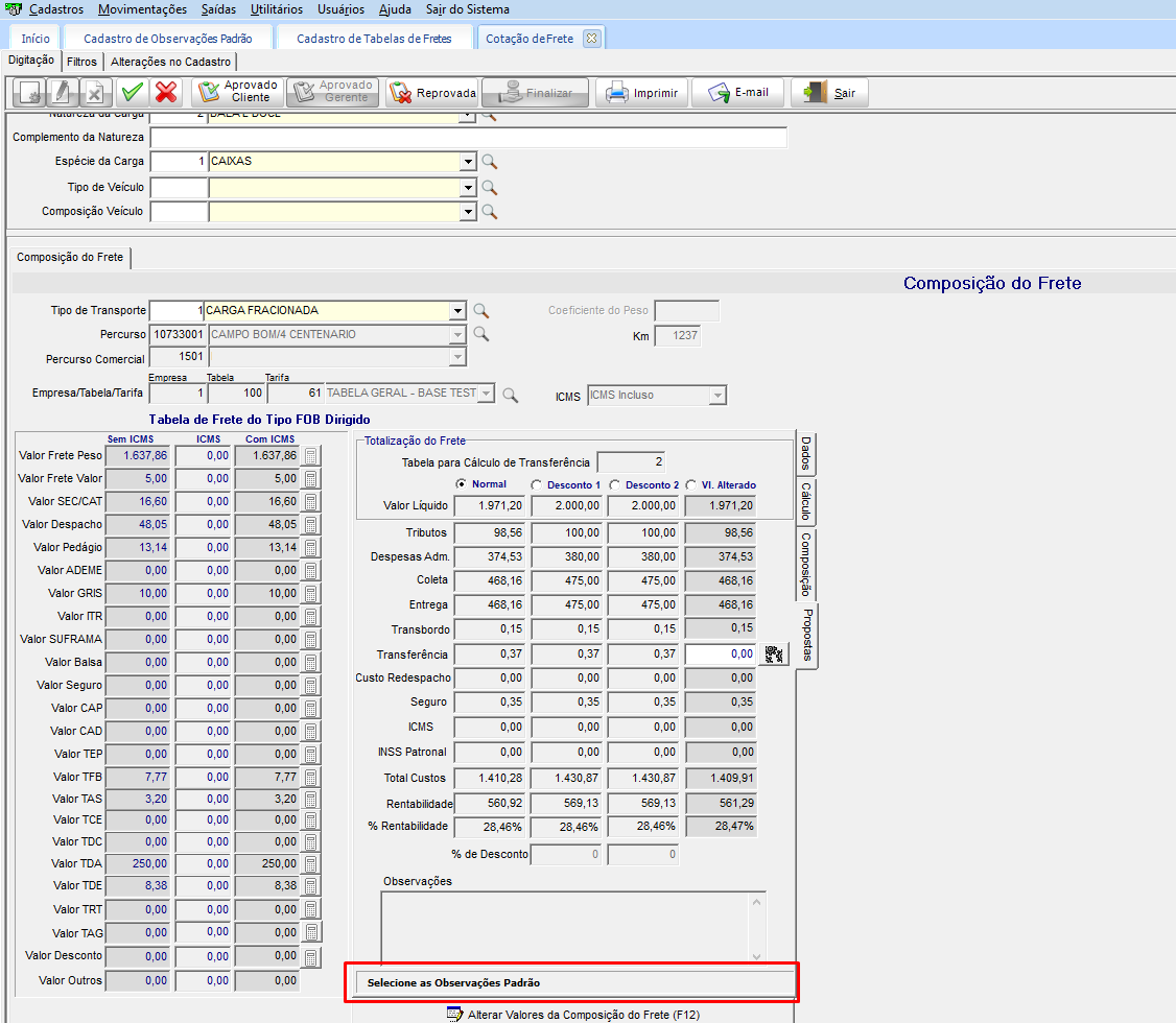 Em Movimentações > Cotação de Frete, na opção de Selecione as observações padrão, permite selecionar de acordo com o tipo cotação e não permite informar uma observação do tipo tabela de frete na cotação.