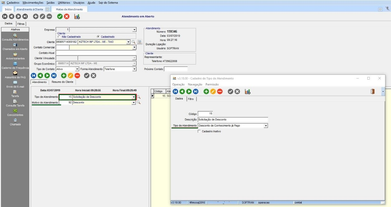 No módulo CRM em Movimentações > Atendimento à Cliente, cadastre um novo atendimento. Na guia Atendimento, informe um tipo de atendimento que esteja relacionado ao novo Tipo de atendimento adicionado no cadastrado. O campo Motivo de Atendimento, precisa ter o tipo de atendimento igual ao campo anterior.