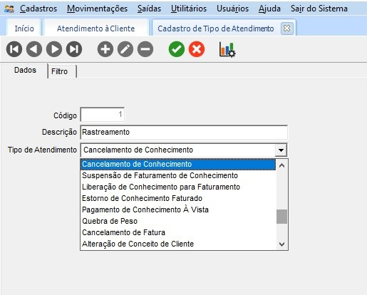Os tipos de atendimento são cadastrados de maneira específica com o processo que será realizado. Onde, para cada tipo de atendimento, precisa ser vinculado a um motivo que esteja de acordo com esse tipo.