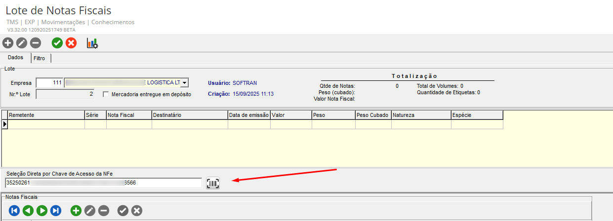 Na tela de Lote de Notas Fiscais, foi incluído o campo Seleção Direta por Chave de Acesso da NFe. Esse campo permite a leitura do código de barras e a validação da emissão de etiquetas, proporcionando maior agilidade no processo.
